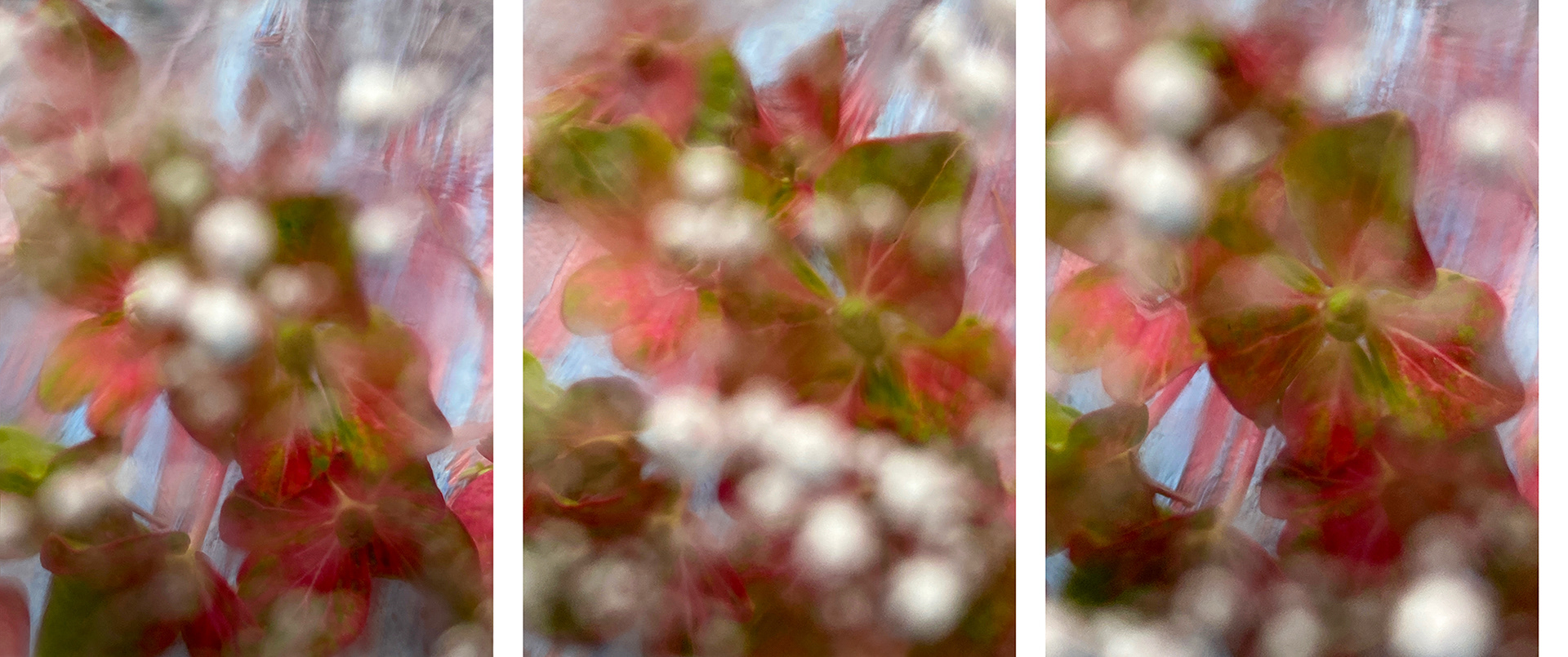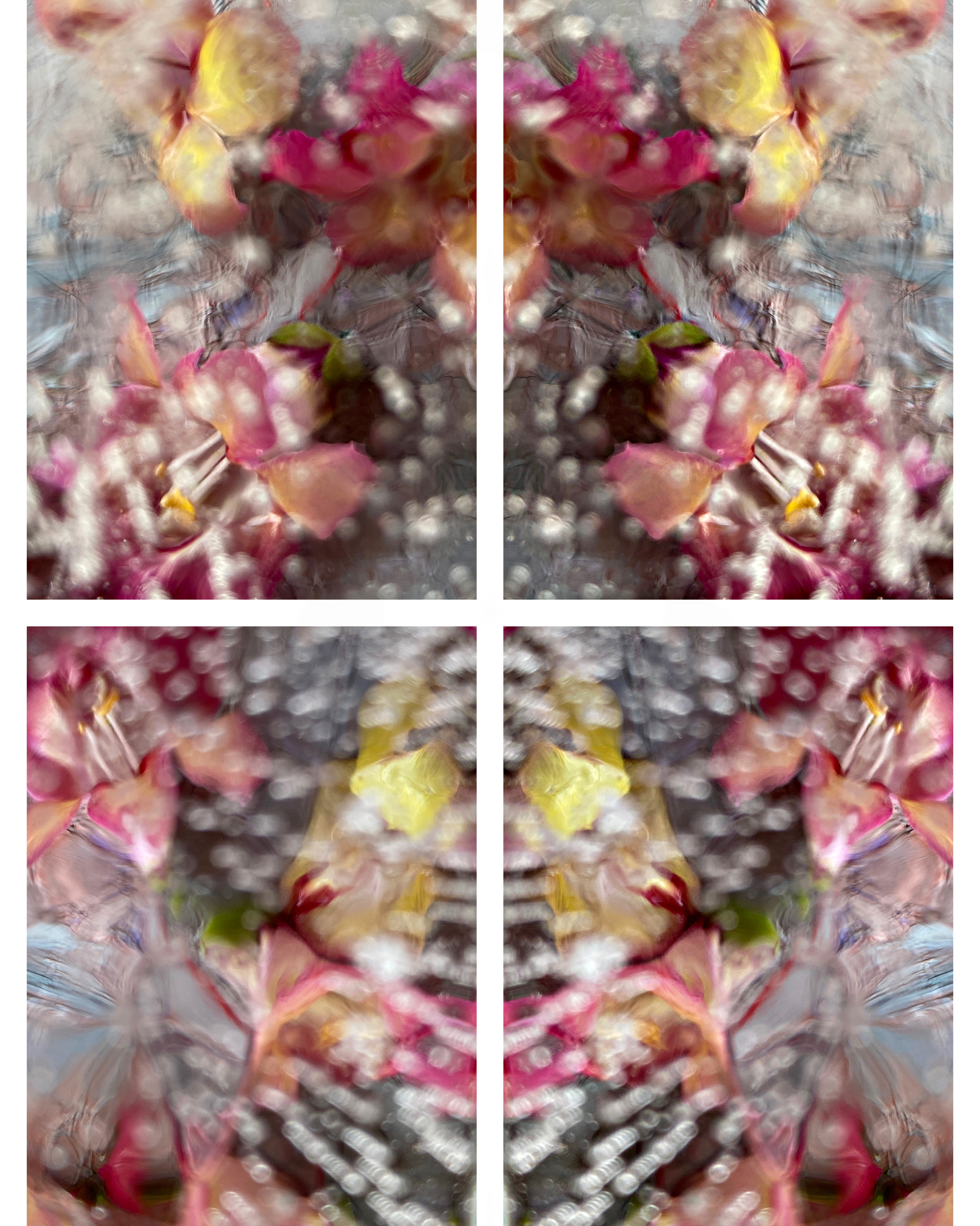 Fragile, transparent, and reflective, the ice melts and reforms in the barely freezing temperatures. Trapped air is exhaled in bubbles that flow with the current, closing in then bouncing out from petals, which themselves are moving with the waves. Retaining their shape as they rise, they defuse the light into pearls, until sometimes breaking open to glitter the surface that traps them. It’s an intricate dance that both obscures and articulates these blooms, once alive and growing, now frozen in time for study.